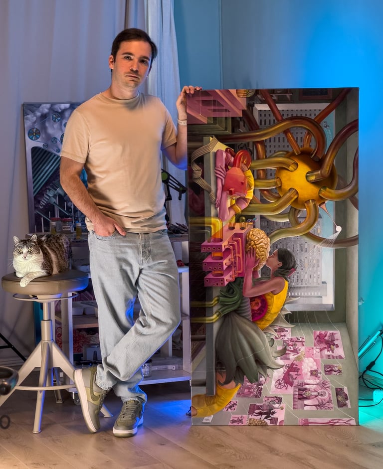 Victor Fota is a visual artist born in 1989, from Bucharest, Romania. He's been studying arts formally since 4th grade. He is a graduate of the University of Fine Arts in Bucharest. Has a Bachelor's degree (2012) and a Masters's degree (2014) in Art History, specialising in Conservation and Restoration of fine art and cultural heritage works of art. After his University years, Victor focused mainly on oil painting, generating most of his ideas on the canvas with the help of digital tools for conceiving the designs. For his paintings, he uses a clean technique that resembles the old Flemish and Venetian methods of rigid forms and successive glazes of paint. With this technique, he creates allegorical surreal images, almost digital like, that impress with the use of photorealism and rich details.