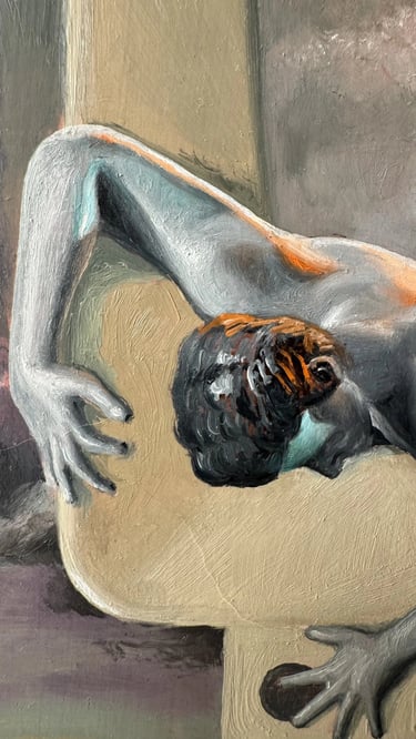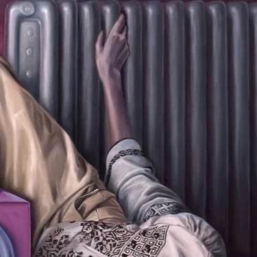 Somewhere close to finishing the painting there was something that really bothered me; the right side of the painting seemed empty and unbalanced. This revelation, combined with the fact that her position in this painting so far had an awkward position that I didn’t see before bothered me even further. So I decided I must add her right hand into the picture to balance the image. Her right hand grabbing the radiator seemed the obvious way to go, this also balances the painting and it also gives a bit more meaning to it.