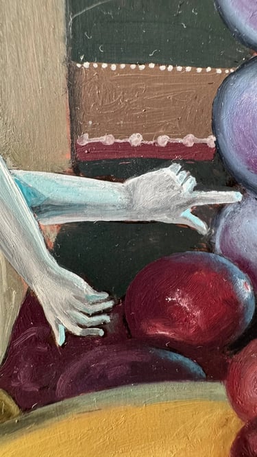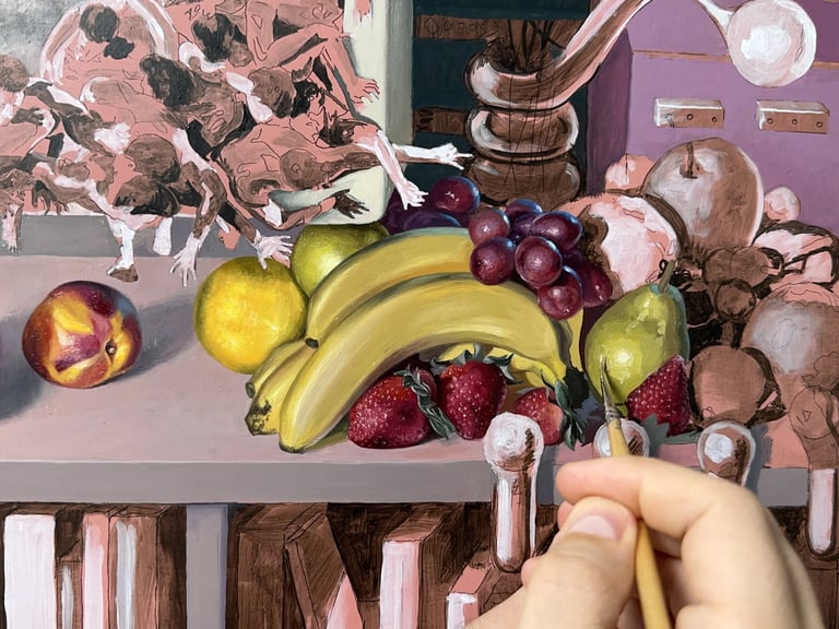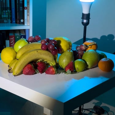I felt quite pleased with this direction I had chosen, so I decided to bring it into Procreate on my iPad, where I would have the opportunity to develop it further and explore its potential in greater detail. I wanted to integrate a detailed still-life. I first went to the market and eagerly bought a colorful bunch of fresh fruits. Once again, I had no concrete arrangement in mind just yet for the fruits; I simply knew that I needed to collect a generous stack of fruits. My goal was to select 2-3 of each fruit that looked particularly good. I would then take my time to carefully consider how I wanted to artistically arrange them in a way that would convey my intended vision later on. I used my iPhone, a direct white light from a flashlight, and a blue side light, and took this photo, img. 2