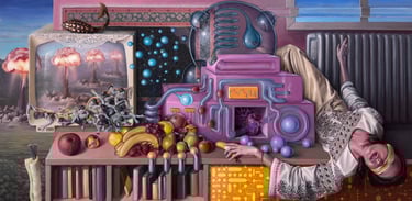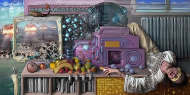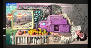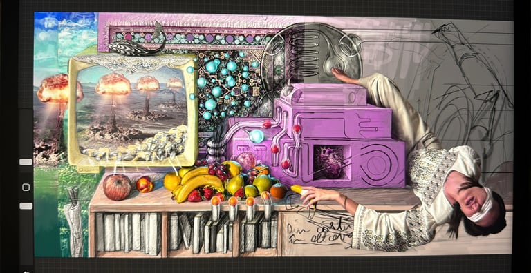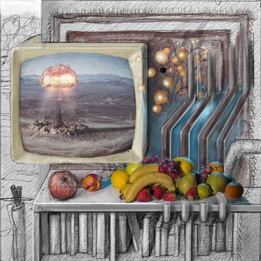 In img. 4, I already uploaded the still life and my sketch in Procreate and I began the process of photo bashing. This is when I basically make a collage of my available photos to establish a composition. I also thought that an atomic explosion (Img. 3) displayed on the monitor would create an antithesis. I also established that this contrast of safety/danger should dominate my mind while thinking of further developing this sketch.