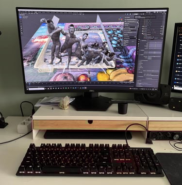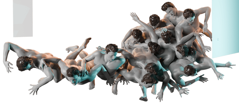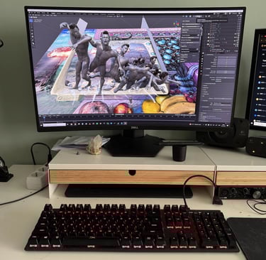 Probably the most intense job I had to do for this study was the modeling of the little male figures that want to come out of the monitor (Img. 9). The figures are imported from Daz and modeled in Blender, an open source 3d software (Img. 10). They were particularly difficult because I had to take into consideration their position within the monitor and the 3 light sources, orange from behind, blue from the bottom right, and White from the left side.. All these had to be good enough to give the illusion that they belong there.