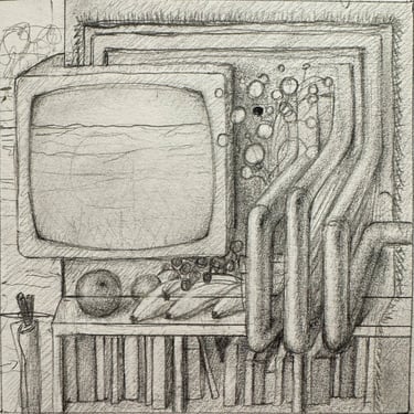 For this initial sketch, I just sat and drew something from my imagination. As I went along, I found that my present state of mind wanted something cozy, like a still life, with some nostalgic feel, combined with an old tech, like a CRT monitor. This initial vision guided me as I translate my thoughts onto paper.