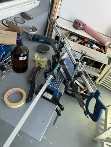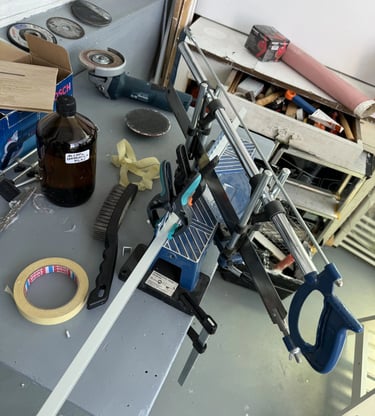 It's time to focus on one of my favorite parts of getting ready for a new painting.; The making of the aluminium panel. The process is simple but takes a lot of attention to make it high quality. First, I buy the actual sheet of aluminium. In the past I used 2mm sheets with L profiles on the back for reinforcement, but for this project, I want to experiment with a 1 mm sheet and with square profiles for reinforcement, which are more rigid and can compensate for the thinner sheet. The profile is manually cut at a 45 degree angle (Img. 12)