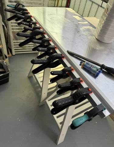 To attach the reinforcement, I use 2 epoxy resin components, which I believe is ideal for this application. The bond is strong and flexible enough to withstand any reasonable stress. For a good bond, I prepare the surfaces that will be glued together with some rough sandpaper and a very tough metal tool to create deep indents in a crosshatch pattern. I apply the glue thinly and I use as many clamps as I can to get a very even pressure bond (Img. 13). Although this takes about 15 minutes to harden, I leave them for at least a few hours.